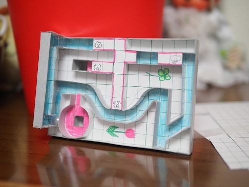 ↑方眼用紙で作った迷路。中のボールを転がします。